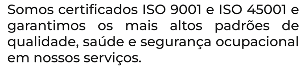 Somos certificados ISO 9001 e ISO 45001 e garantimos os mais altos padrões de qualidade, saúde e segurança ocupacional em nossos serviços.